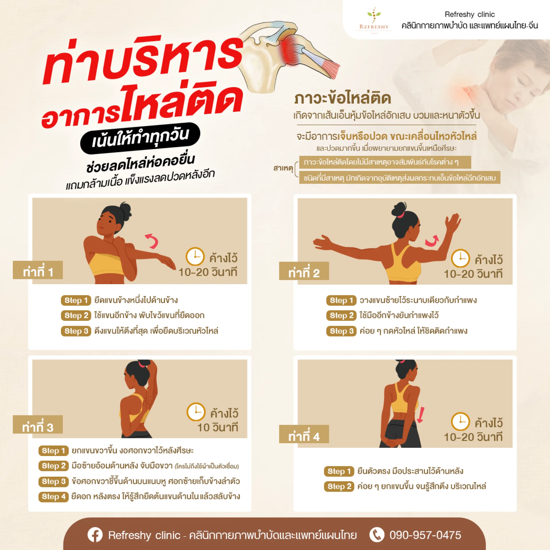 ดังนั้นทางรีเฟรชชี่คลินิก จึงอยากให้ทุกคนมาลองทำท่าบริหารหัวไหล่ ป้องการการเกิดไหล่ติด ทำให้อาการติดลดลง ขยับได้ดีขึ้นไปด้วยกันค่ะ