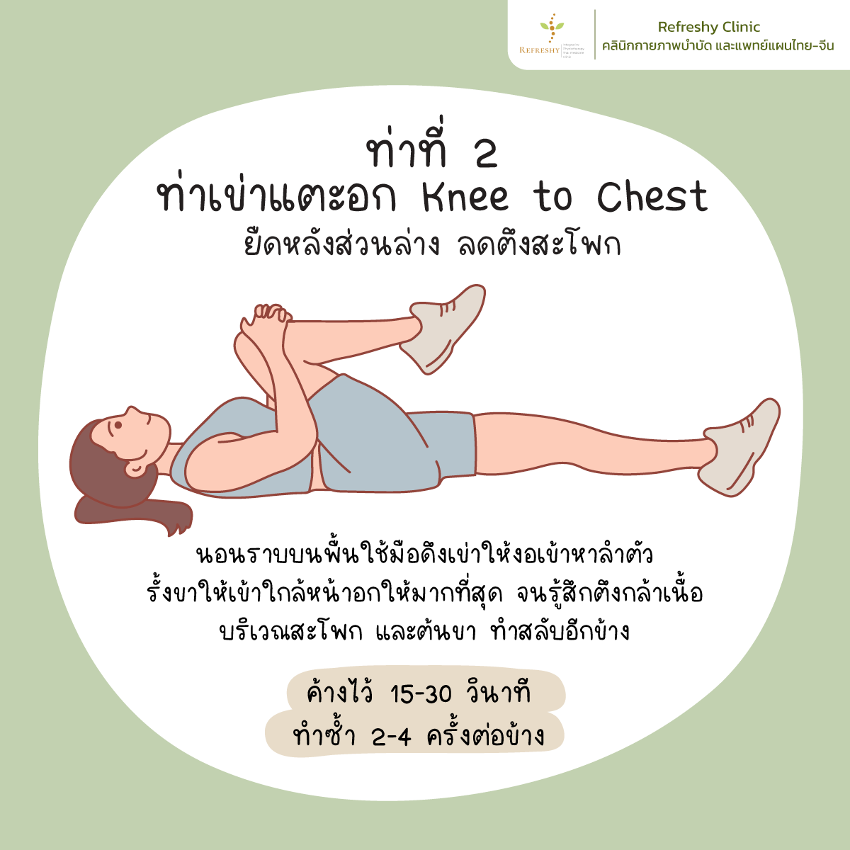 วิธีทำ: นอนราบกับพื้น ใช้มือดึงเข่าเข้าหาลำตัว รั้งขาเข้าใกล้หน้าอกมากที่สุดจนรู้สึกตึงกล้ามเนื้อบริเวณสะโพกและต้นขา ทำสลับอีกข้าง