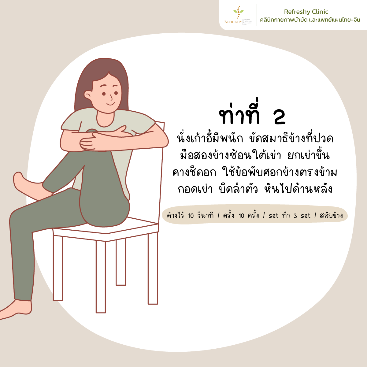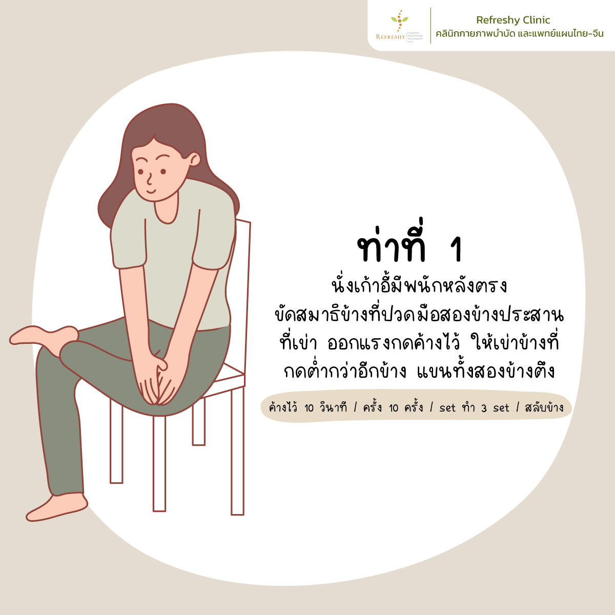 ท่าที่ 1 (นั่งกดเข่า) : นั่งหลังตรง นำขาข้างที่ปวดขึ้นมาพาดเป็นเลข 4 ใช้มือสองข้างประสานที่เข่าแล้วกดลงเบาๆ ให้เข่าต่ำกว่าอีกข้าง แขนเหยียดตึง