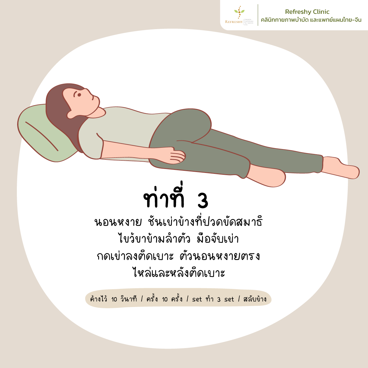 ท่าที่ 3 (นอนราบกดเข่า) : นอนหงาย ชันเข่าข้างที่ปวดไขว้ข้ามลำตัว ใช้มือช่วยกดเข่าลงให้ติดเบาะ โดยที่ไหล่และหลังทั้งสองข้างยังต้องแนบสนิทกับพื้น